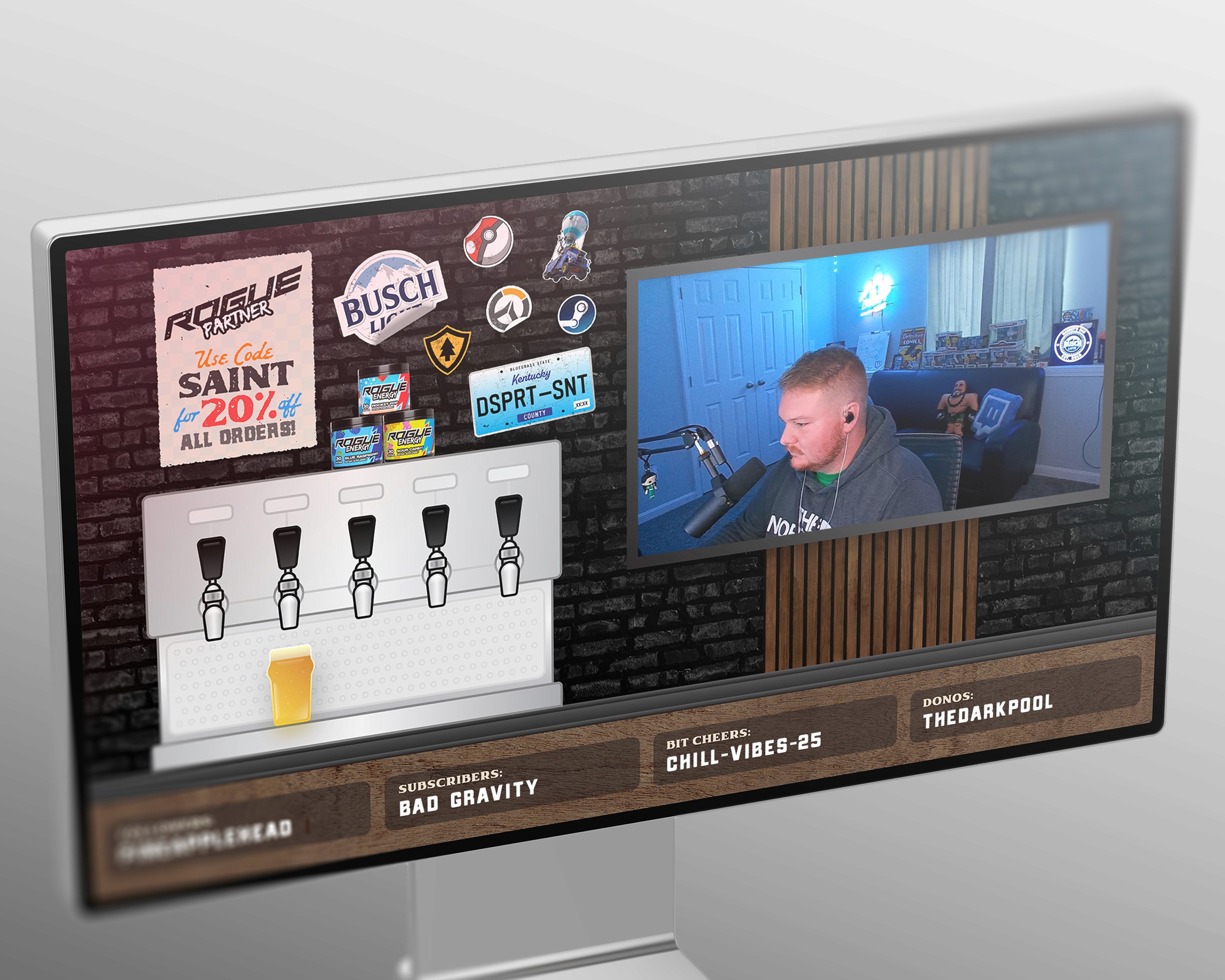 Garret, AKA Desperate Saint, is a friend of mine who has also previously been my client. A few years ago, I created a stream package for him that was energetic and sporty. He basically handed the creative reigns over to me and was stoked with what I made him. A couple years went by and he honed in on the look and feel he wanted for his stream: Dive bar.
