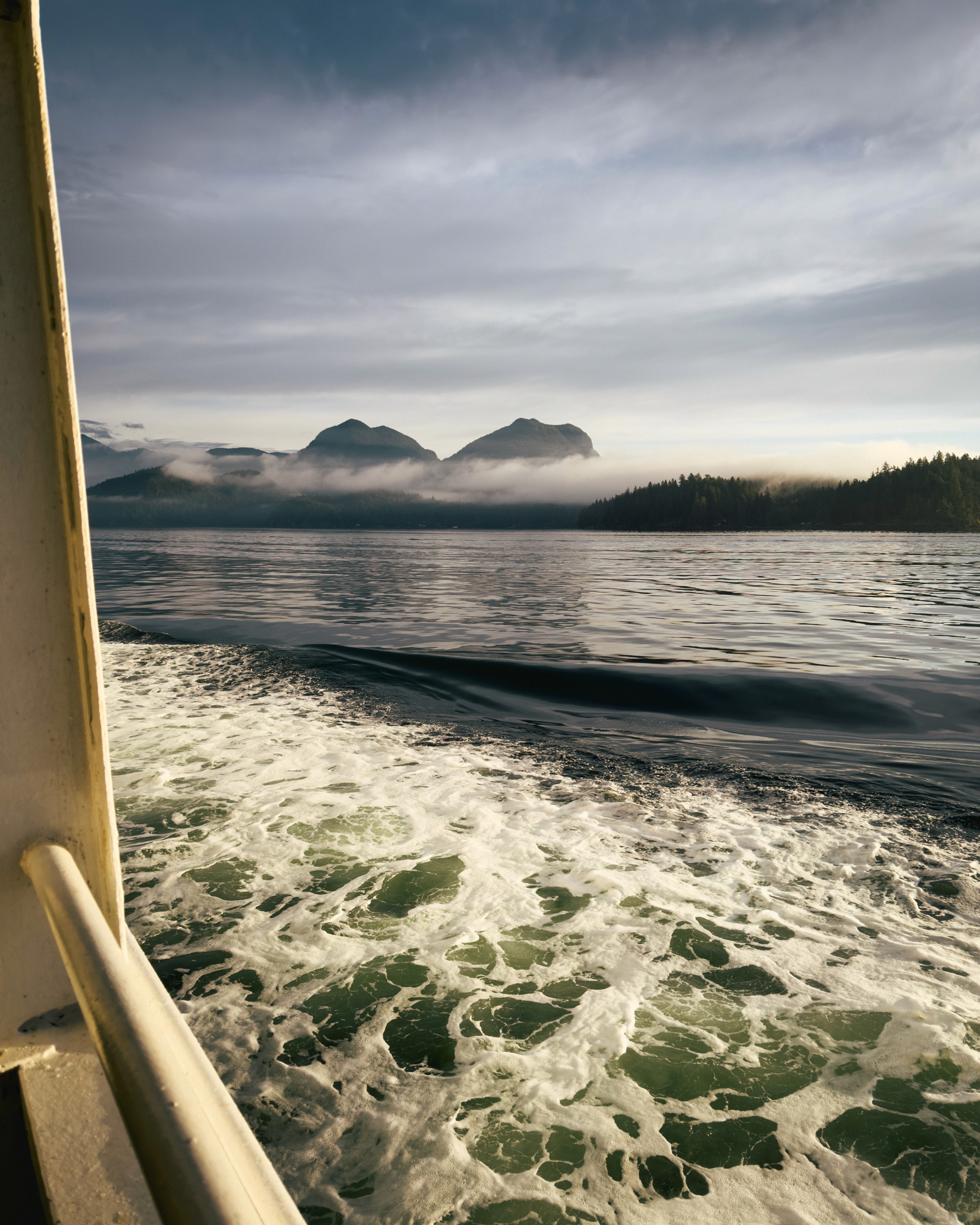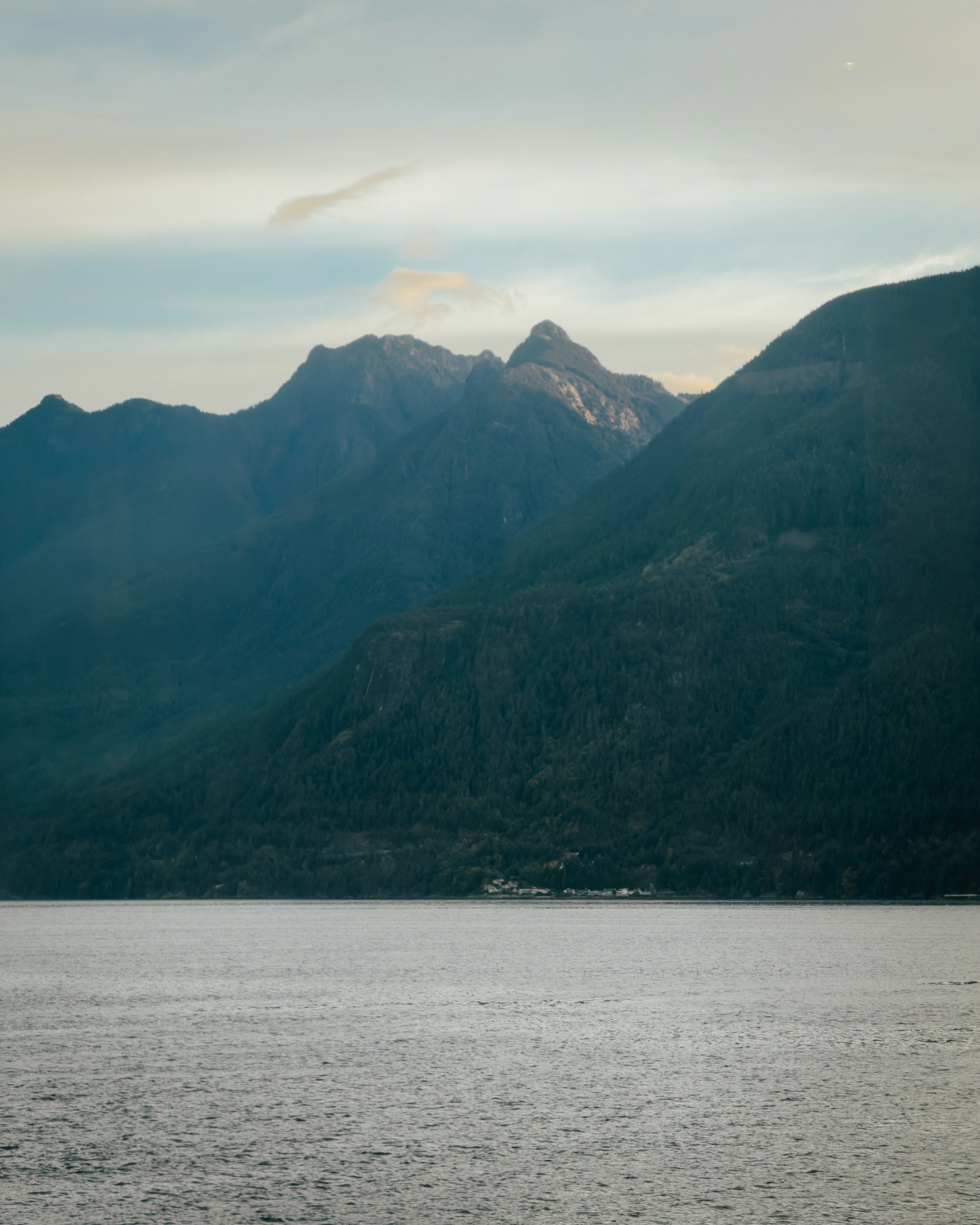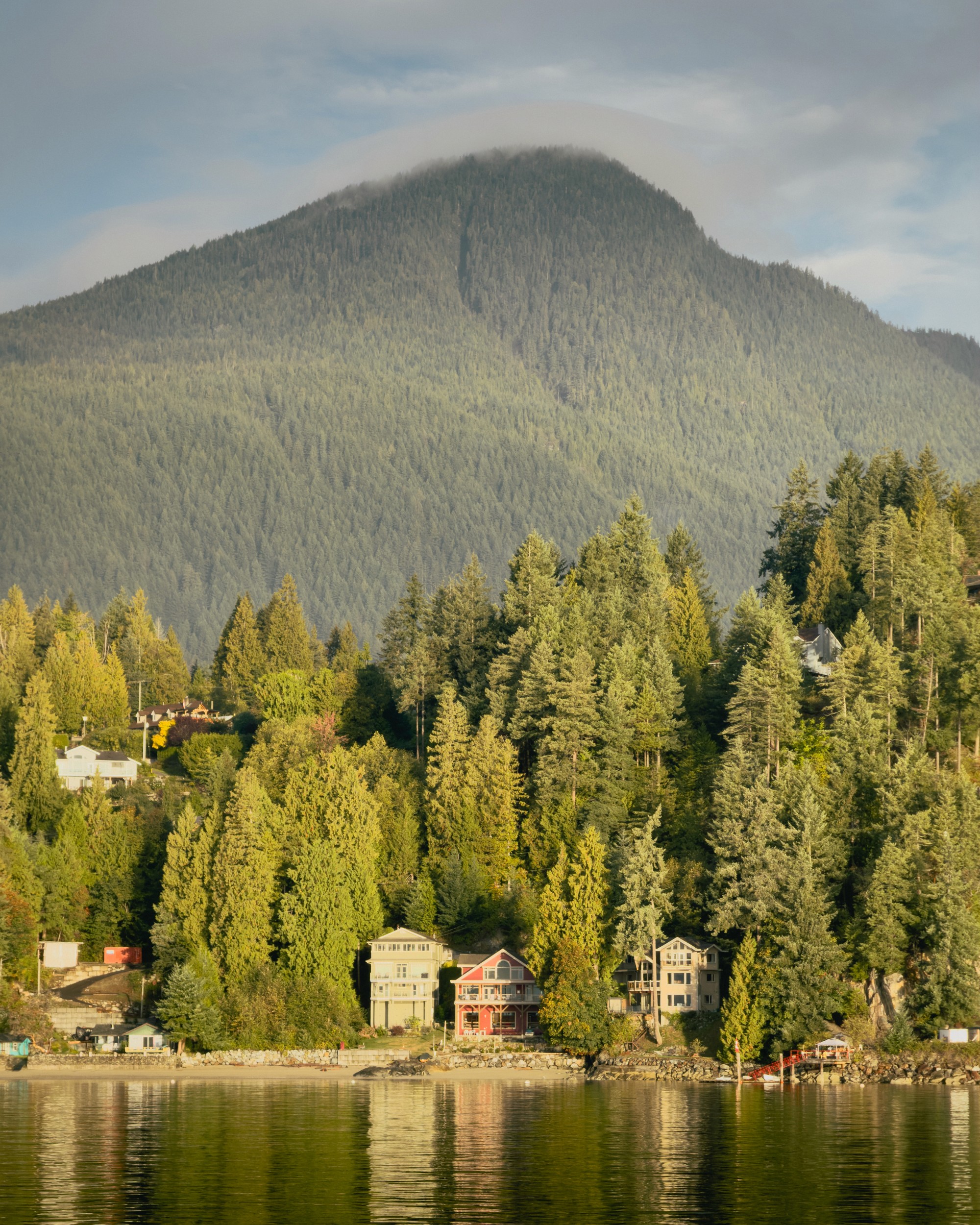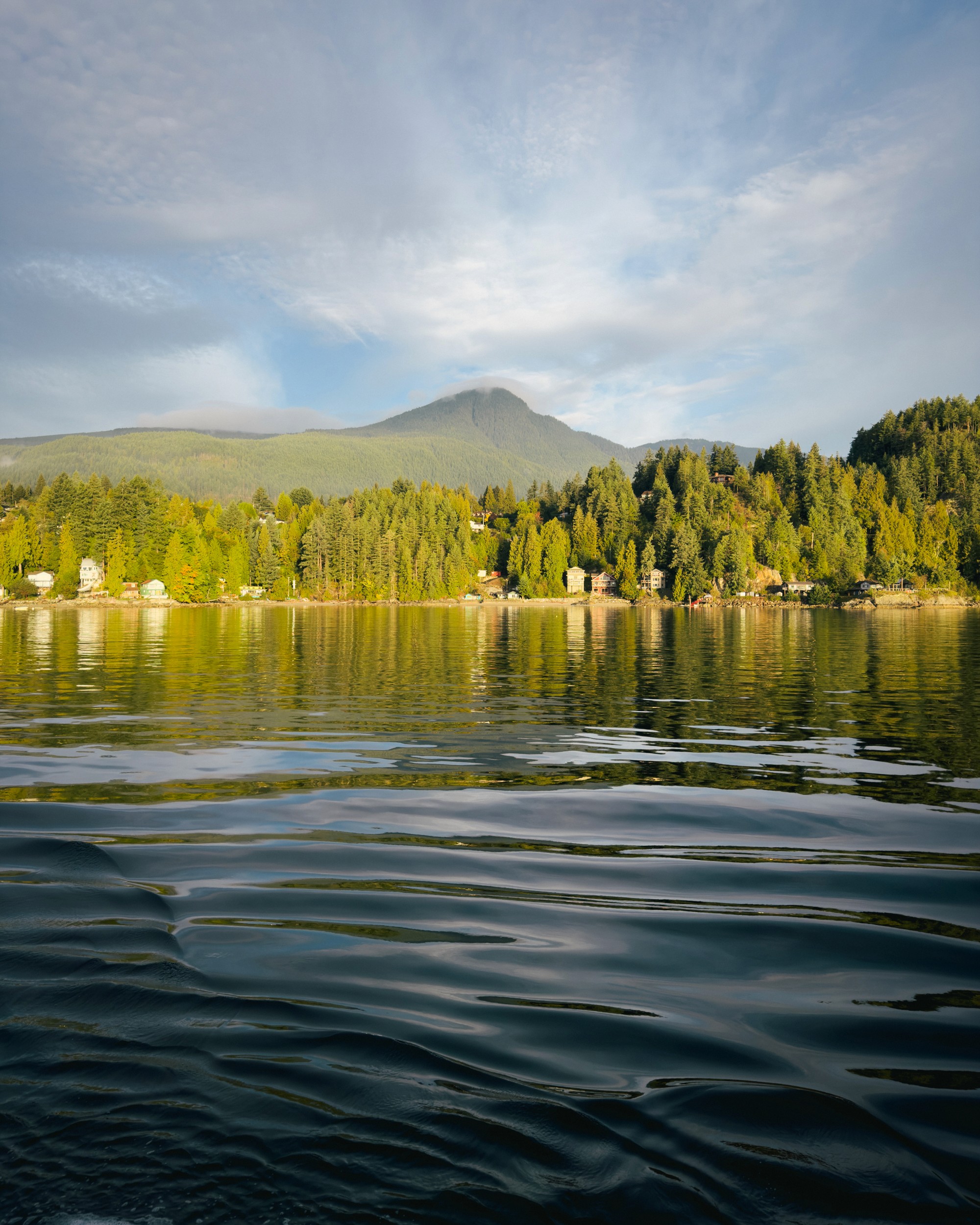 As our short voyage came to a close, the sun was a bit higher in the sky and was illuminating the landscape with a more direct light—that initial softness had faded. The trees became quite vibrant, and all the houses along the water basked in the early Autumn sun. Mount Elphinstone loomed in the background, clouds casting shadows across it.